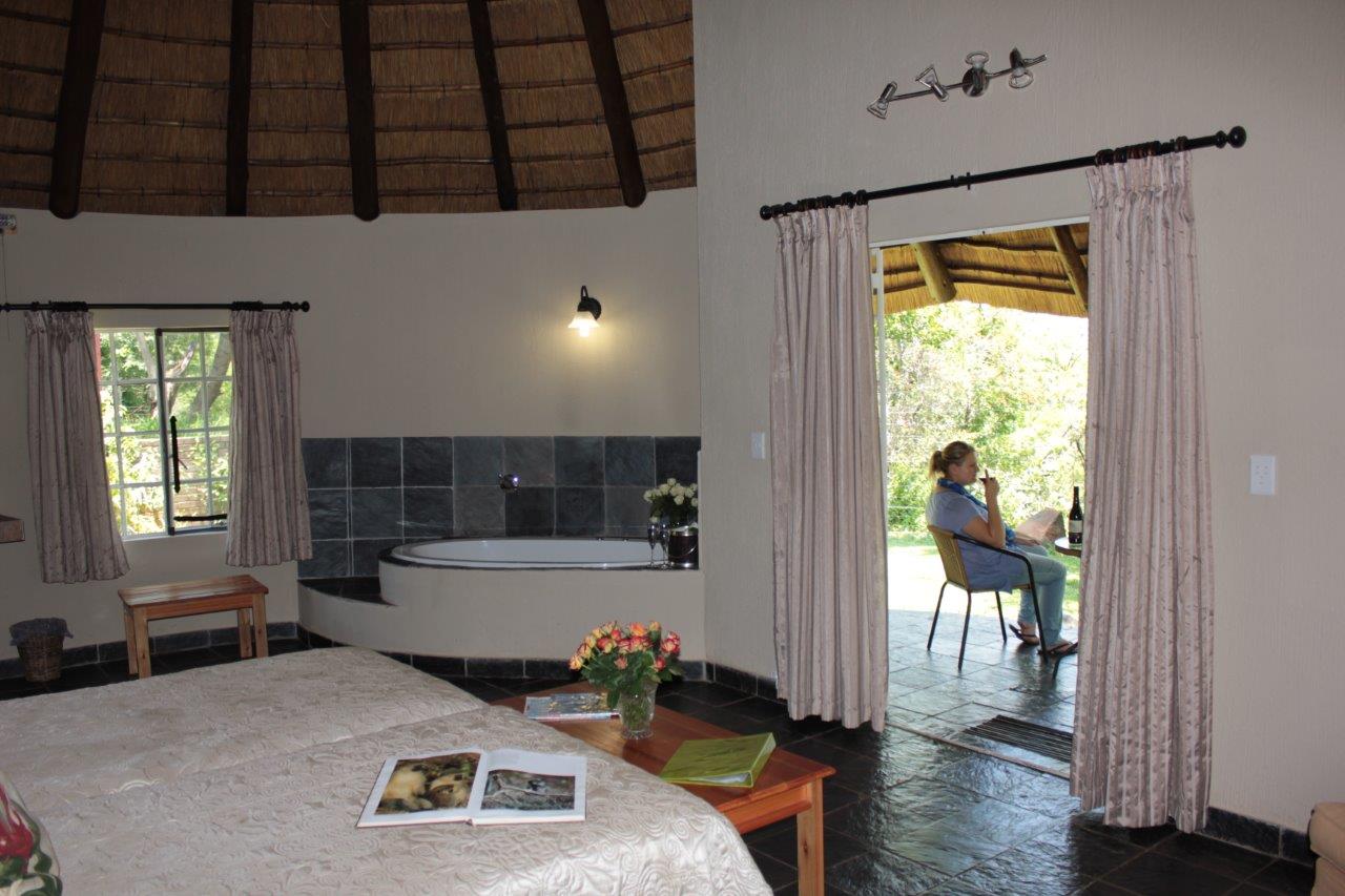 This Rondavel has 2xsingle beds side by side (or KING), private spa-bath, shower en suite, Ceiling Fan & semi-kitchenette equipped with a bar fridge, microwave, kettle, toaster, cutlery and crockery & private verandah. a Braai(barbecue) facility ideal for the evenings you want to spend alone, with views over the Sabie Valley and natural bush.