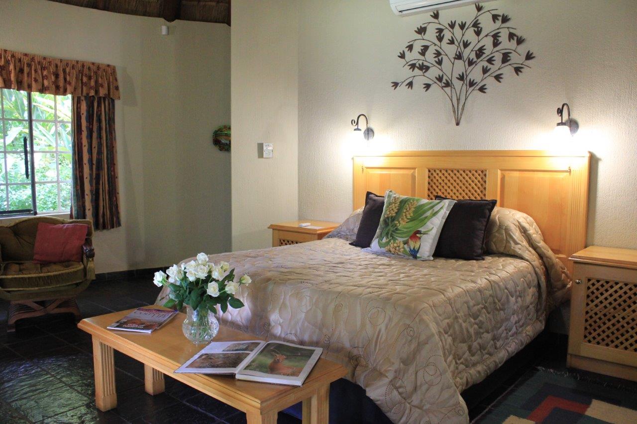 The Honeymoon Rondavels each have a queen-size bed, private spa-bath, shower en suite, Air-conditioning.